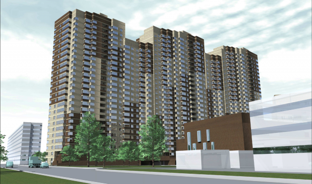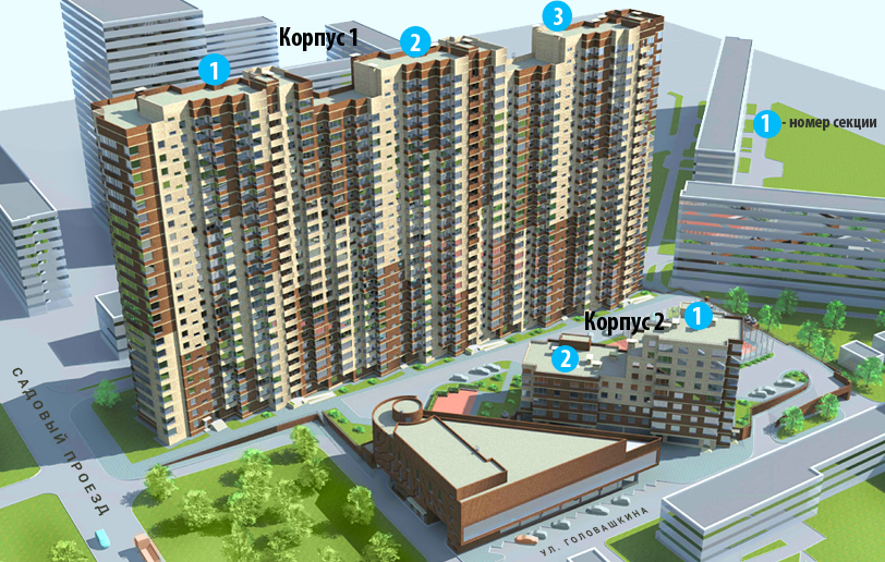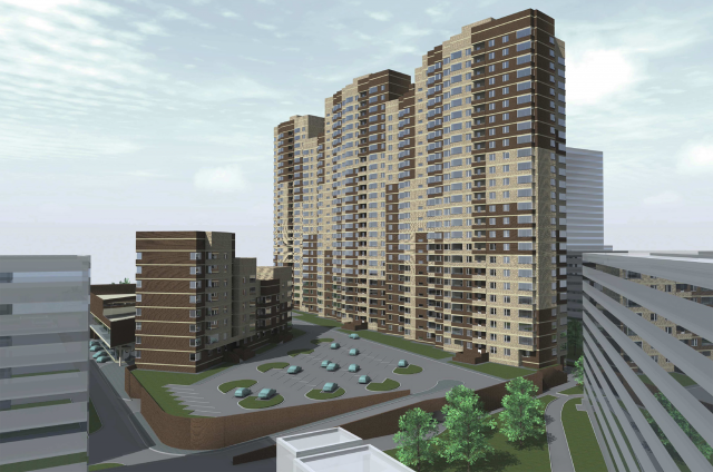 Состоит из трех секций от 22 до 25 этажей, с кладовыми и м/местами на 1 и 2 этажах.